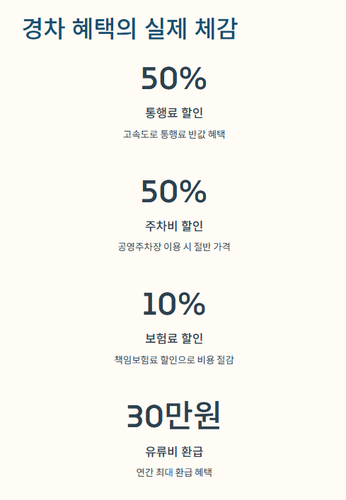 A: 취등록세 감면, 자동차세 할인, 고속도로 통행료 및 공영주차장 주차비 50% 할인, 책임보험료 10% 할인 등의 혜택이 있습니다.