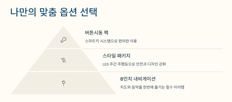 프레스티지 트림으로 결정하고 나서도 옵션 선택의 재미가 쏠쏠했어요. 저는 버튼시동 팩과 스타일 패키지를 추가했는데요, 스마트키 시스템 덕분에 차 키를 꺼낼 필요도 없이 문을 열고 닫을 수 있어서 너무 편했어요. LED 주간 주행등은 디자인도 예쁘고 안전에도 도움을 줘서 강추! 8인치 내비게이션은 지도 보랴 음악 듣랴 완전 필수 아이템이었고요. 2025 레이 모의견적을 통해 옵션을 하나하나 선택해보니 진짜 내 취향대로 맞출 수 있어서 뿌듯했답니다.