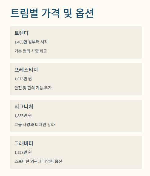 - 트렌디: 1,400만 원부터 시작하며 기본적인 편의 사양 제공