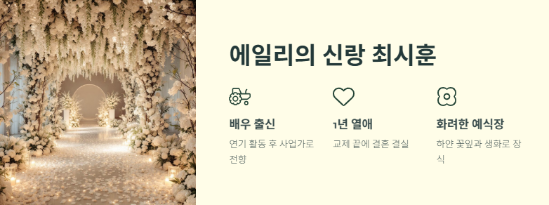 에일리의 남편 최시훈은 배우 출신 사업가로 알려져 있습니다. 두 사람은 1년여의 열애 끝에 결혼이라는 결실을 맺었고, 강남의 한 예식장에서 비공개로 예식을 올렸죠. 예식장은 하얀 꽃잎과 생화로 꾸며져 마치 드라마 속 한 장면 같았다고 해요.