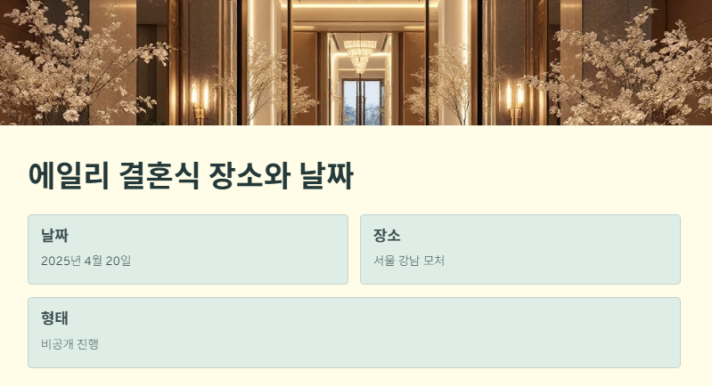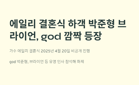 가수 에일리의 결혼식이 2025년 4월 20일 비공개로 치러졌습니다. 현장에는 god의 박준형, 브라이언 등 유명 인사들이 하객으로 참석해 눈길을 끌었는데요. 특히 SNS를 통해 공개된 이들의 모습은 팬들 사이에서 큰 화제를 모으고 있습니다. 본 포스팅에서는 결혼식의 분위기와 참석자들의 스타일, 팬들의 반응 등을 40대 여성 블로거의 시선으로 담아봤습니다.