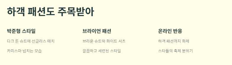 하객 패션도 주목받았어요. 박준형은 다크 톤의 슈트에 선글라스를 매치해 카리스마를 뽐냈고, 브라이언은 브라운 슈트에 화이트 셔츠로 깔끔하면서도 세련된 모습을 보여줬습니다. 결혼식은 물론, 하객의 패션까지 팬들의 관심을 끌기에 충분했죠.
