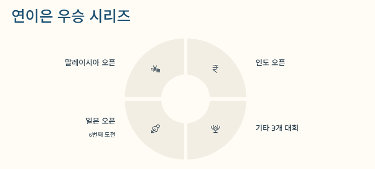 → 말레이시아, 인도오픈 등 5회 우승했고, 이번에 6회 연속 우승에 도전 중입니다.