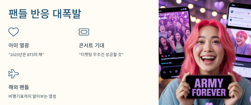 내가 요즘 아미톡방에서도 보고, 트위터랑 인스타에서도 보고 있는데 팬들 반응 장난 아님. 다들 “2025년은 무조건 BTS의 해다”, “완전체 콘서트 열리면 무조건 티켓팅 성공하고 말 거야” 이런 반응이야.