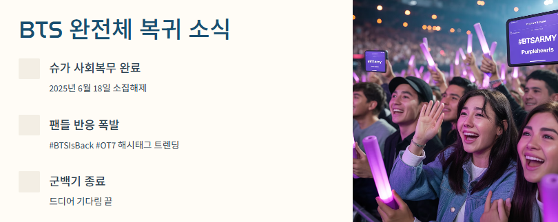 2025년 6월 18일, 방탄소년단(BTS) 멤버 슈가가 사회복무요원 복무를 마치면서 드디어 BTS 멤버 전원이 전역 완료했다는 소식이 전해졌다. 팬들은 완전체 복귀를 기다리며 SNS를 뜨겁게 달구고 있다. 이번 글에서는 1. 사회복무 완료 BTS 소식과 2025년 복귀 계획, 2. BTS진, BTS 제대 일정과 팬 반응, 3. 완전체 활동 기대감과 팬덤 분위기를 자세히 정리해본다.
