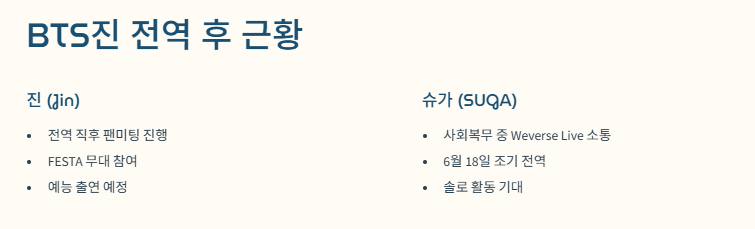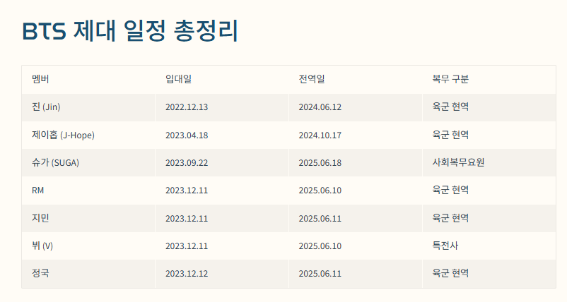 | 슈가 (SUGA) | 2023.09.22 | 2025.06.21(→18일 조기) | 사회복무요원 |