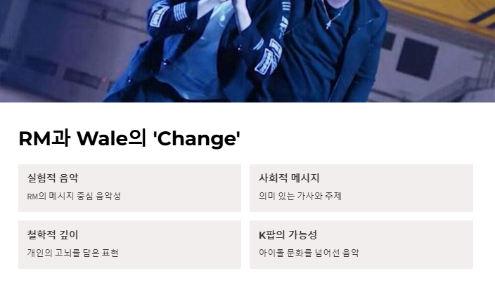 RM은 방탄소년단 내에서 가장 실험적이고 메시지 중심의 음악을 선보이는 멤버로 꼽히는데, 그런 그의 ‘Change (with Wale)’는 방탄소년단 역대 최고의 K팝 랩 컬래버레이션 5곡 중에서도 독보적인 색채를 자랑합니다.