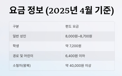2025년 4월 기준 요금은 아래와 같으며, 왕복 시 2배로 계산하시면 됩니다.