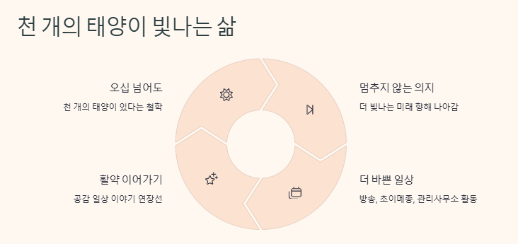 ‘유인경 작가의 책 제목처럼, 오십 넘어도 천 개의 태양이 있다’는 표현은 최은경이 삶을 대하는 철학을 보여준다.