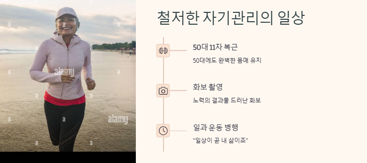 그녀는 “일을 쉬어본 적이 없어요. 일상이 곧 내 삶이죠”라며 일과 운동을 병행하는 루틴을 밝혀 화제가 되었다.