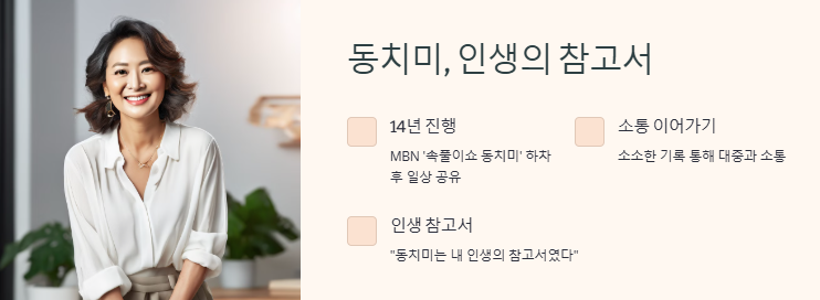 방송인 최은경은 14년간 진행했던 MBN ‘속풀이쇼 동치미’에서 하차한 뒤, 일상 속 소소한 기록들을 공유하며 대중과의 소통을 이어가고 있다. 그녀는 “동치미는 내 인생의 참고서였다”고 표현하며, 자신의 성장 스토리를 진심 담아 전했다.