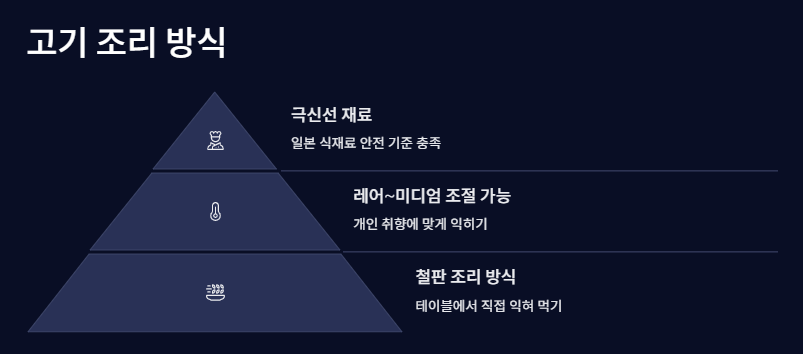 처음 나올 땐 고기가 살짝 레어 상태인데요, 철판 위에서 익혀 먹는 방식이라 원하는 만큼 조절 가능해요. 근데 진짜! 초반에 먹었을 때 그 촉촉함이 너무 미쳤어요. 진심으로 “이래서 추성훈이 극찬했구나…” 하고 감탄했습니다.