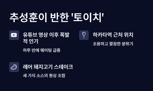 후쿠오카 여행 중 추성훈이 방문한 ‘토이치’ 돼지고기 스테이크 맛집은 유튜브 영상 이후 폭발적인 인기를 얻고 있다. 직접 방문한 후 느낀 맛과 분위기, 웨이팅 팁까지 생생하게 전한다.