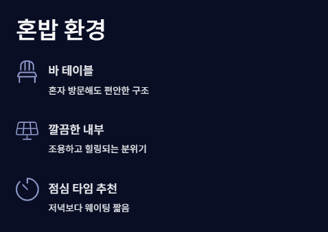 바 테이블 있고 조용한 분위기라 혼밥 강추예요. 저도 혼자였는데 편했어요!