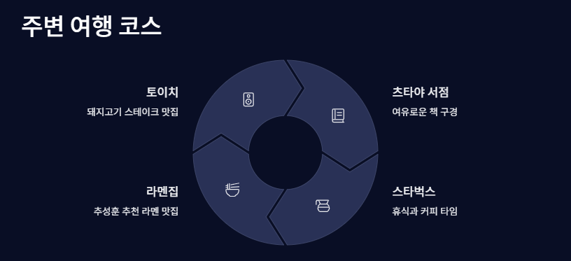 저는 ‘토이치’에서 점심 먹고 바로 옆 츠타야 서점이랑 스타벅스 들렀어요. 여행의 여유가 딱 느껴지는 코스였죠. 아, 그리고! 근처에 ‘추성훈 후쿠오카 라멘’으로 유명한 라멘집도 있어서 고기-커피-라멘으로 이어지는 꿀조합 코스 완성 가능이에요!