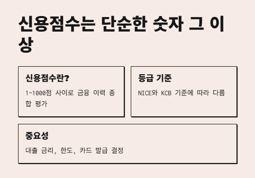 - 과거 신용등급제 대신 현재는 신용점수제로 운영되며, 1~1000점 사이 점수로 금융 이력을 종합 평가해요.