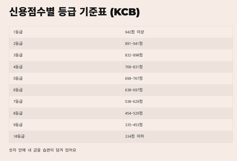 신용점수별 등급 기준표 (KCB 기준)