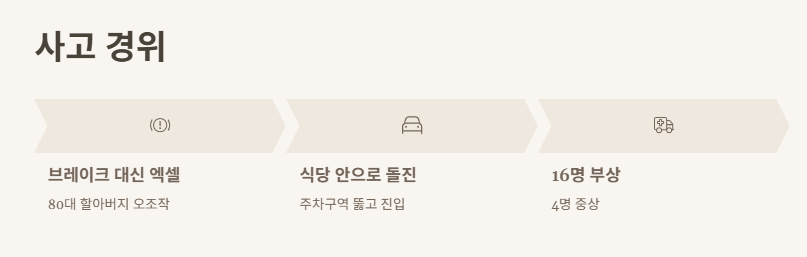 알고 보니까 80대 할아버지가 SUV를 몰다가 브레이크 대신 엑셀 밟았다고 해요. 차가 주차구역을 뚫고 그냥 식당 안으로 돌진한 거죠. 경찰 조사에선 음주나 약물은 아니라고 했어요. 아마 순간적으로 판단이 안 되셨던 것 같아요…