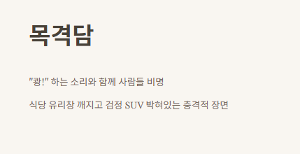 점심시간 조금 넘은 11시 30분쯤이었어요. 갑자기 "쾅!" 하고 엄청 큰 소리가 나더니 사람들이 비명을 지르면서 막 뛰쳐나왔어요. 저도 너무 놀라서 일어나보니까, 식당 유리창 깨져 있고, 안쪽에 검정 SUV가 박혀 있는 거예요. 진짜 영화 촬영장도 아니고 너무 충격이었어요…