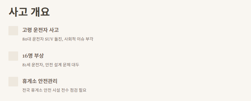 81세 운전자의 SUV 돌진으로 다수 부상자 발생, 안전 설계 문제 대두. - 휴게소 안전관리, 이대로 괜찮을까?