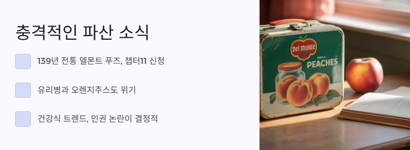 솔직히 나 어릴 때부터 아침에 학교 가기 전에 엄마가 싸주던 도시락에 꼭 들어있던 게 델몬트 유리병에 담긴 복숭아 통조림이었어. 그 새콤달콤한 맛은 진짜 내 추억 그 자체였는데, 며칠 전에 “델몬트 파산”이라는 기사를 보고 깜짝 놀랐어. 세상에, 그렇게 오래된 브랜드가 파산보호를 신청했다니…