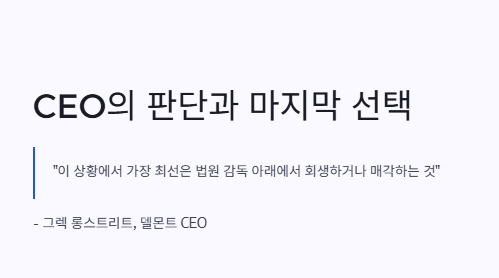 델몬트 CEO 그렉 롱스트리트는 “이 상황에서 가장 최선은 법원 감독 아래에서 회생하거나 매각하는 것”이라고 말했어. 이 말도 사실상 ‘우린 이대로 가면 안 돼요’라고 공개 선언한 거지.
