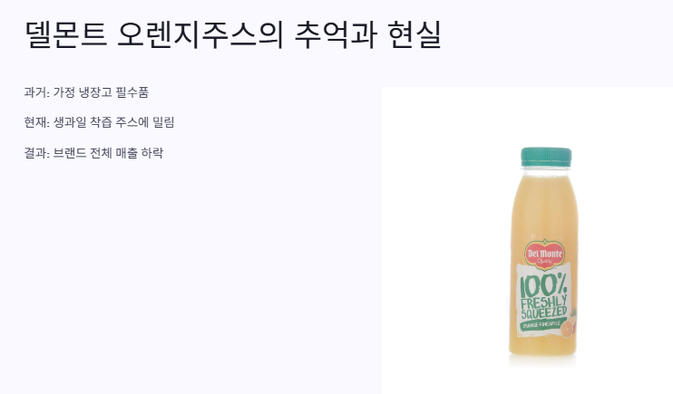 우리 집 냉장고에도 항상 델몬트 오렌지주스 있었는데… 요즘은 솔직히 그 가격이면 생과일로 착즙된 주스를 사 먹게 되더라고. 그러다 보니 자연스럽게 “델몬트 오렌지주스”도 매출이 줄었을 거고, 이게 누적되면서 브랜드 전체가 흔들린 것 같아.