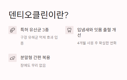 사실 저는 양치만 하면 잇몸에서 피 나는 게 너무 스트레스였어요. 입 냄새도 걱정되고, 아침에 일어나면 입안 텁텁한 거 진짜 싫었고요. 근데 치과는 무섭고 돈도 많이 들잖아요? 그때 검색하다 알게 된 게 바로 덴티오클린이었어요.