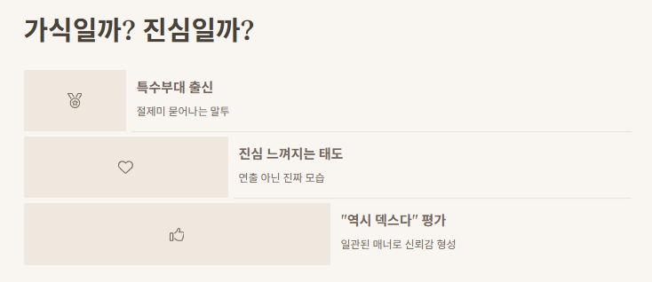 성실한 이미지, 정직한 말투, 외모, 그리고 특유의 인간적인 매력 덕분이에요.