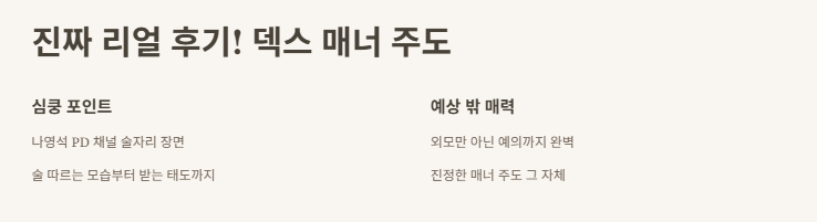 덱스 매너 주도는 그냥 포장된 이미지가 아니라, 진짜 성격에서 나온 거라서 더 진정성 있게 다가오는 것 같아요. 특히 MZ세대는 이런 ‘진짜 느낌’에 민감하잖아요. 그래서 그런가, 술자리 장면 하나로 SNS 댓글이 난리였어요. “이런 남자 어디서 파나요?” “매너가 얼굴을 완성하네” 같은 말들 진짜 공감 백퍼!
