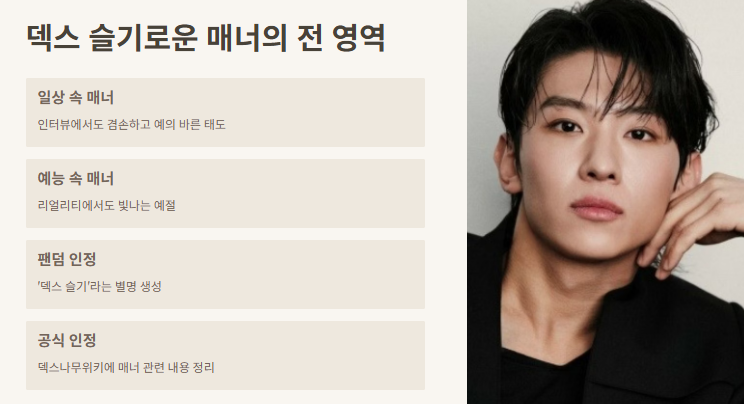 덱스 매너 주도는 술자리에서만 빛나는 게 아니에요. 일상 속에서도 인터뷰나 리얼리티 예능에서도 늘 겸손하고 예의 바르더라고요. 그래서 '덱스 슬기' 같은 말이 생길 정도예요. ‘덱스나무위키’에도 매너 관련 내용이 따로 정리돼 있을 정도니까요.