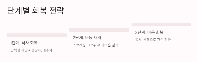 2단계: 운동 재개 – 맨몸 스트레칭부터 시작해서 2주 후 가벼운 걷기