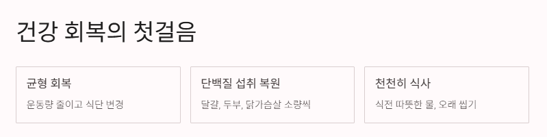 1단계: 식사 회복 – 위에서 말한 단백질 식단 + 소화 보조 티 (생강차, 대추차)