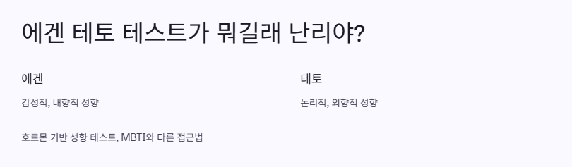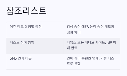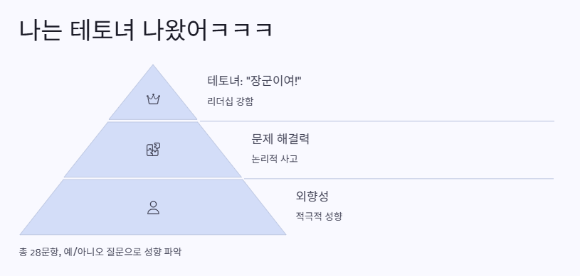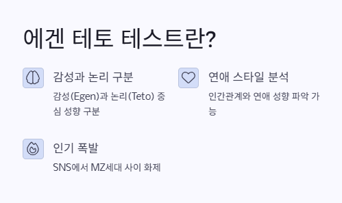 – 감성(Egen)과 논리(Teto) 중심 성향을 구분하는 신개념 테스트로, 자기 이해와 연애 스타일 분석에 특화 - 나의 실제 테스트 후기