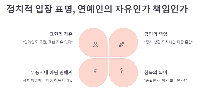 정치적 입장을 밝히는 연예인을 향한 시선은 엇갈린다. 일부는 “그들도 국민이고 표현의 자유가 있다”고 옹호하지만, 또 다른 일부는 “공인이 특정 정치 성향을 드러내면 대중은 혼란스럽다”고 우려한다. 윤 대통령 탄핵 국면에서 연예계는 어느 쪽이든 입장을 밝히는 순간 논란에 휩싸이는 구조에 놓였다.