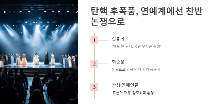 반면, 윤 대통령 탄핵을 환영하는 연예인들은 ‘표현의 자유’를 강조했다. 그들은 이제야 말로 마음 놓고 노래하고 연기할 수 있는 시대가 왔다고 반겼다. 이처럼 탄핵 이슈는 연예계의 갈등 지형을 그대로 드러내는 촉매제가 됐다.