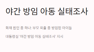 - → 부모 외출 중 발생한 어린이 사망 사고로 국민적 충격, 정부가 즉시 후속 조치 지시.