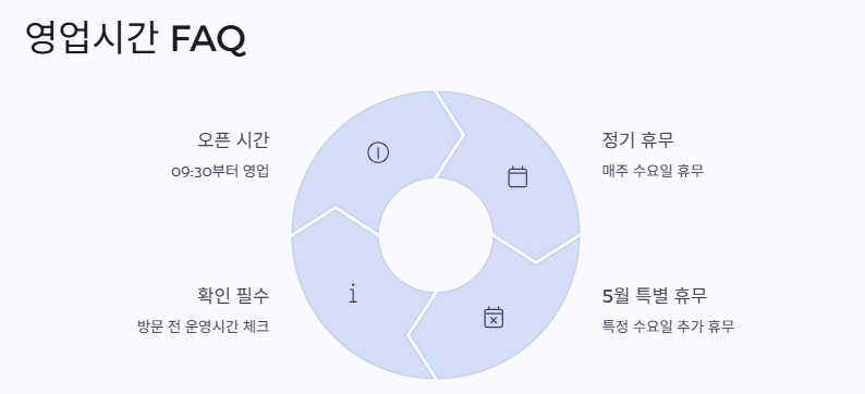 09:30부터 오픈하고, 수요일은 휴무예요. 5월엔 특정 수요일도 쉬어요.