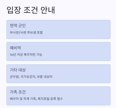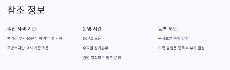 출입 자격은 현역·군무원·10년 이상 예비역 및 가족에 한정됨 (국방복지단 고시 기준)