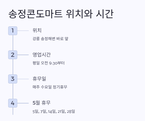 제가 두 번이나 방문했을 때 느낀 점인데요, **"강릉 송정콘도마트 영업시간"**은 생각보다 짧고 일찍 마감할 때도 있었어요.