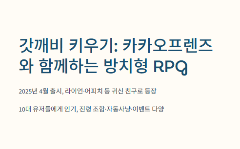 2025년 4월 18일 정식 출시된 '갓깨비 키우기'는 카카오프렌즈와의 콜라보로 눈길을 끄는 방치형 모바일 RPG 게임이다. 라이언, 어피치 등 친숙한 캐릭터들이 귀신 친구로 등장하며, 진령 조합 시스템과 자동사냥, 다양한 보상 이벤트 등으로 10대 유저들에게 큰 인기를 끌고 있다. 이 글에서는 10대 여성 유저의 시선으로 갓깨비 키우기를 플레이한 실제 경험담과 함께 게임의 주요 포인트를 소개한다.