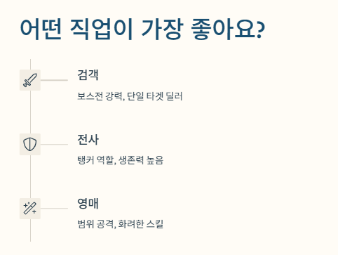 처음에 엄청 고민했는데, 나는 검객 골랐어. 이유는 단일딜이 세고, 보스전에서 진짜 탱탱 치는 맛이 있음. 전사는 딱히 땡기진 않았고, 영매는 스킬은 화려한데 범위딜이라 초반엔 좀 애매하더라. 너도 보스전 즐기는 스타일이면 검객 추천할게!