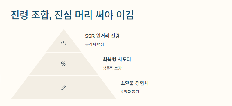 내 기준 추천 조합은 무조건 원거리 SSR 하나는 넣고, 회복형 서포터 필수야. 난 운 좋게 초반에 SSR 어피치 나와서 지금까지 잘 써먹고 있어. 진짜 중요한 건 ‘소환풀 경험치’! 무턱대고 소환하지 말고 좀 쌓았다가 뽑는 게 SSR 나올 확률 높아짐!