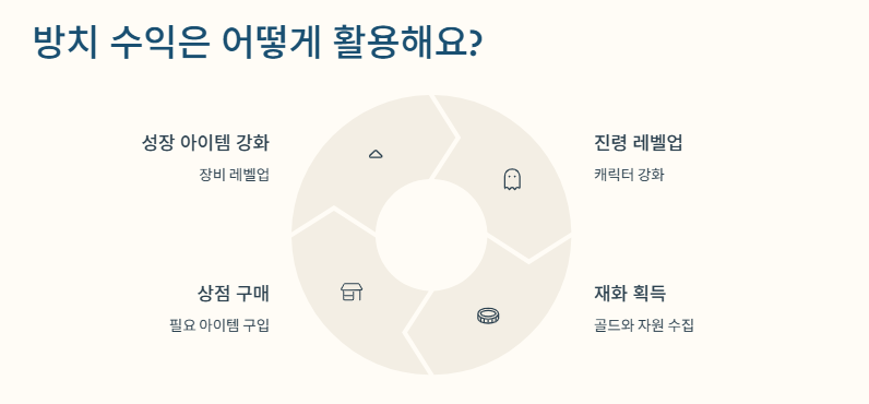 Q. 방치 수익은 어떻게 활용해요? 성장 아이템 강화나 진령 레벨업에 사용하면 효율적이에요.