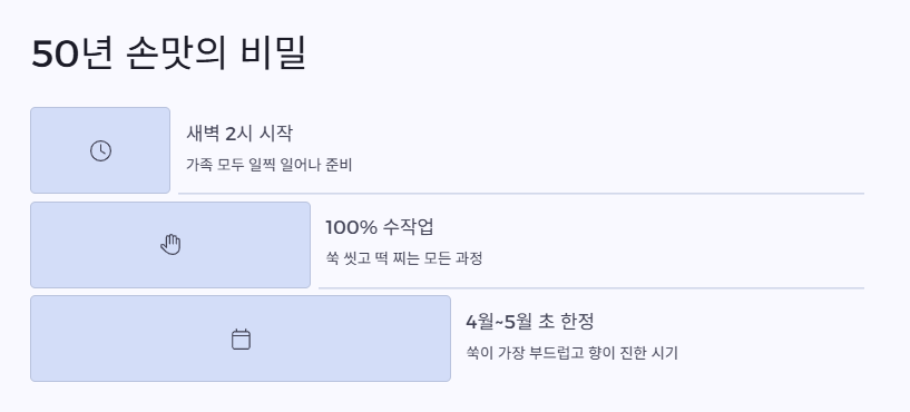 쑥떡이 왜 봄에만 주문 가능한지도 알게 됐어. 쑥은 보통 4월~5월 초 사이에 가장 부드럽고 향도 진해서 딱 그때만 쑥떡을 만들 수 있대. 그 이후엔 자연히 품절되는 거고, 그러니까 '극한직업 쑥떡 지금 아니면 1년 기다려야 함'이라는 말이 괜히 있는 게 아님.