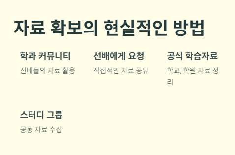 기출비 자료 확보는 학생들에게 가장 큰 고민거리 중 하나입니다. 보통은 자신이 직접 기출문제를 정리하거나, 선배에게 자료를 요청하거나, 커뮤니티에서 공유 자료를 찾는 방식을 활용합니다. 기출비에서 자주 언급되는 '기출비 일반등업 방법'을 중심으로 다음과 같은 전략이 추천됩니다.