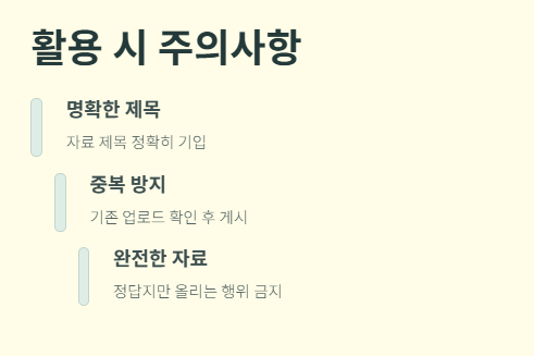 자료 제목을 명확히 기입하고, 중복 업로드를 피해야 하며, 정답지만 올리는 행위는 금지되어 있습니다.