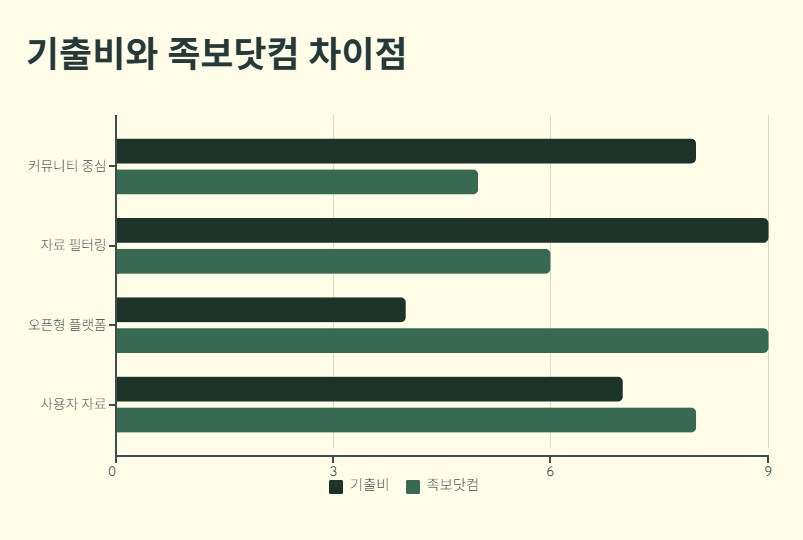 기출비는 내부 등업 시스템과 커뮤니티 중심, 족보닷컴은 사용자가 제출한 자료 중심의 오픈형 플랫폼이라는 차이가 있습니다.