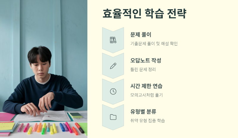 - 시간 제한 연습: 기출비에서 다운로드한 문제를 실전처럼 풀게 한 뒤, 정답과 해설로 피드백하는 방식이 효과적이었습니다.