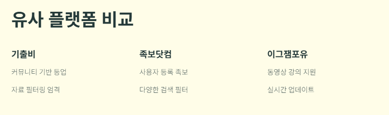 비슷한 성격의 기출문제 커뮤니티로는 족보닷컴과 이그잼포유가 있습니다. 이들과 기출비의 가장 큰 차이는 다음과 같은 요소에서 나옵니다.